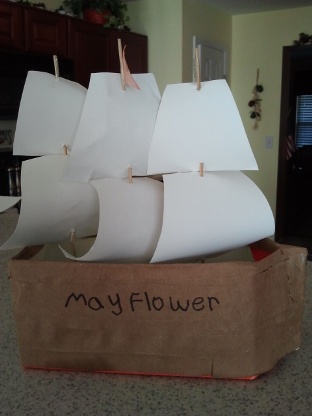 You can bring the supplies to class and have your students each make one of these, or you can make the Mayflower ship ahead of time and then use it during class for the following activity (which our family does every Thanksgiving):
